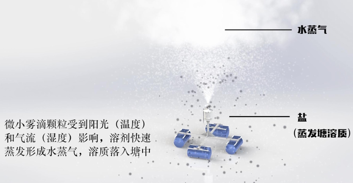 電動機(jī)通過支撐柱安裝在浮臺上,電動機(jī)的動力輸出軸上設(shè)置有扇片,增壓水泵固定在浮臺下方,電動機(jī)外壁上固定有噴水裝置,增 壓水泵通過水管與噴水裝置相連通,噴水裝置的出水口位于扇片的下方。高速運轉(zhuǎn)的葉片將液體打碎形成100~400um的霧滴,微小霧滴顆粒受到陽光(溫度)和氣流 (濕度)影響,溶劑快速蒸發(fā)形成水蒸氣,溶質(zhì)落入塘中。
